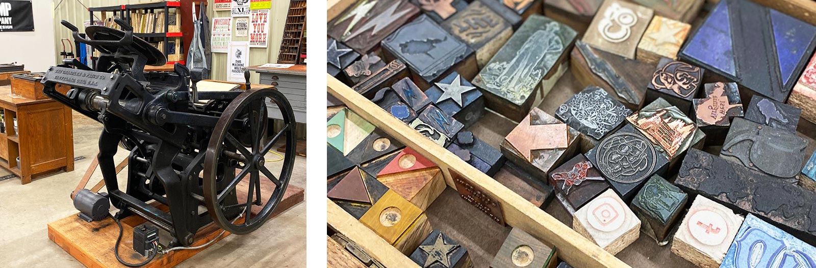 Everything from concert and event posters to personal stationery and wedding invitations is designed in-house and printed by hand on old-school printing presses using traditional methods of setting type and hand-carving images.