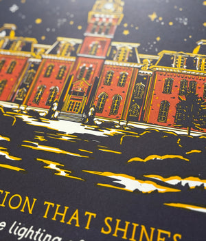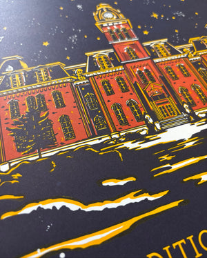 Marking the seventh annual collaboration between the WVU Alumni Association and Base Camp Printing Company, this limited-edition print celebrates the return of a holiday tradition: the lighting of Woodburn Hall at West Virginia University.
